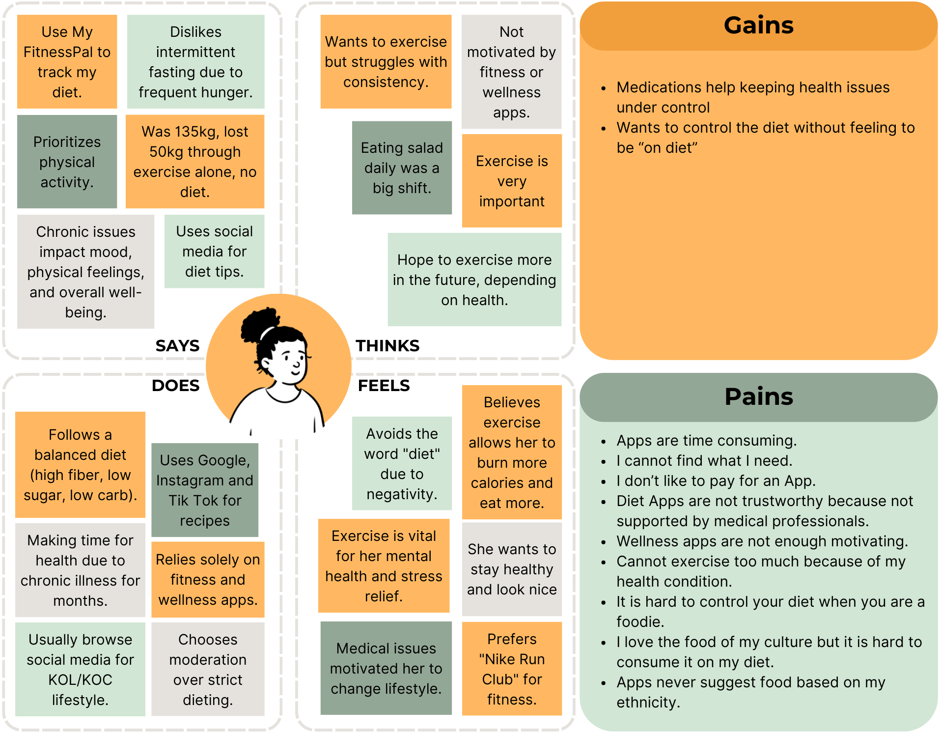 After studying the data, We simplified the key findings, beginning with an empathy map. Formed through interviews, surveys, and observations, the empathy map offered insights into future users' experiences with Healink.